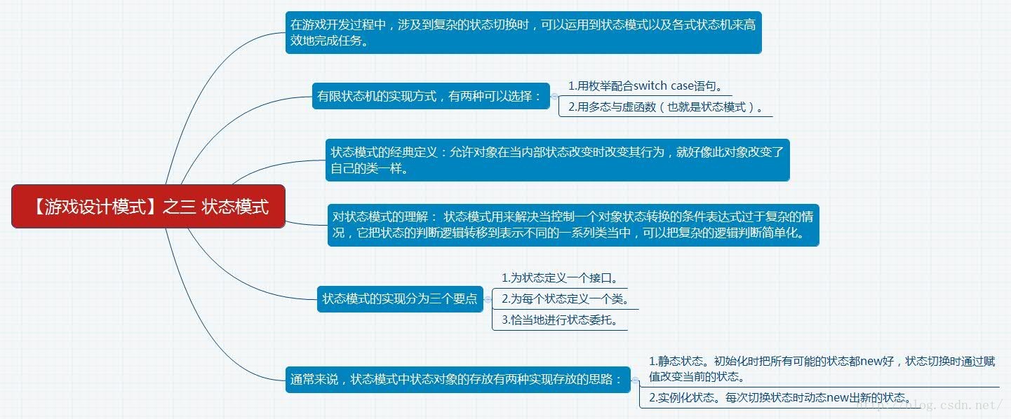 1. 在游戏开发过程中,涉及到复杂的状态切换时,可以运用状态模式以及状态机来高效地完成任务。
