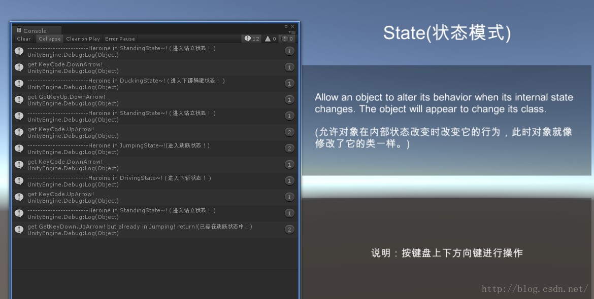 运行场景,按键盘上的上下方向键,可以在console窗口中看到对应的状态,有点游戏发展史早期文字冒险游戏的感觉。运行截图: