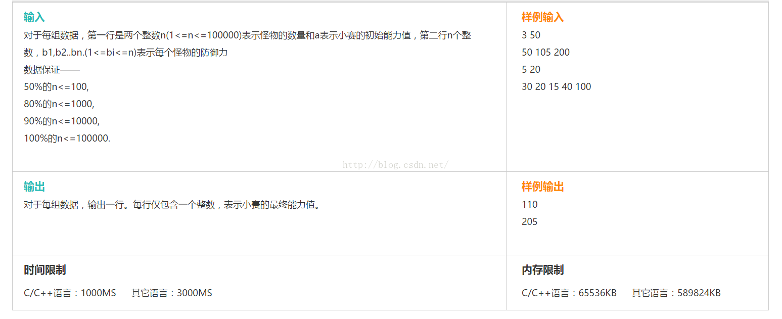 题目描述小赛经常沉迷于网络游戏。有一次,他在玩一个打怪升级的游戏,他的角色的初始能力值为a。在接下来的一段时间内,他将会依次遇见n个怪物,每个怪物的防御力为b1,b2,b3,…bn。如果遇到的怪物防御力bi小于等于小赛的当前能力值c,那么他就能轻松打败怪物,并且使得自己的能力值增加bi;如果bi大于c,那他也能打败怪物,但他的能力值只能增加bi与c的最大公约数。那么问题来了,在一系列的锻炼后,小赛的最终能力值为多少?