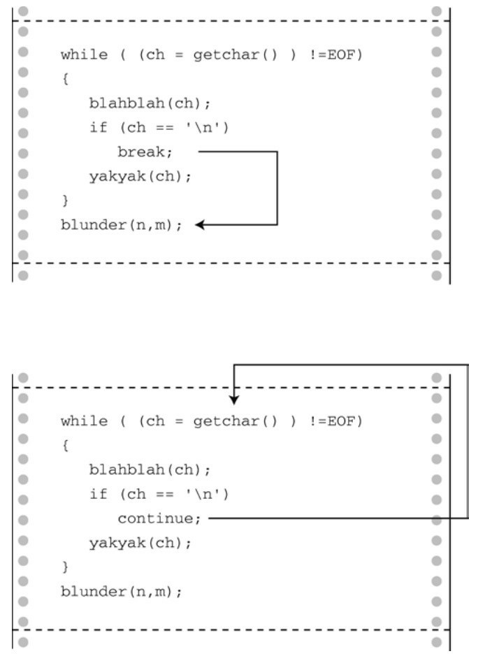 程序执行到循环中的break语句时,会终止包含它的循环,并继续执行下一阶段。把上程序清单中的continue替换成break,在输入150时,不是跳至执行下一轮循环,而是导致退出当前循环。下图比较了break和continue。如果break语句位于嵌套循环内,它只会影响包含它的当前循环。