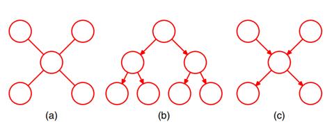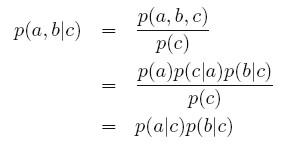以上是贝叶斯网络将联合概率分解为条件概率的方法,比较直观易懂,就不多说了。下面说一下条件独立的表示和判断方法。条件独立是,给定a,b,c三个节点,如果p(a,b|c)=p(a|c)p(b|c),则说给定c,a和b条件独立。当然 a, b, c也可以是三组节点,这里只以单个节点为例。用图表示,有三种情况 。