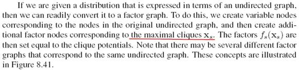 有向图和无向图的概率分解 和 条件独立 都说完了.有向图和无向图是可以互相转换的,有向图转换成无向图,如果每个节点都只有少于等于1个父节点,比较简单。如果有超过1个父节点,就需要在转换之后的无向图上增加一些边,来避免都是有向图上的一些关系,这部分就不细说了。