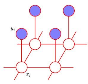 上面那层Yi,是噪声图,紫色表示这些是已知的,是观察值。下面那层Xi是未知的,要求出Xi,使Xi作为像素值得到的图,尽量接近无噪声图片。每个xi的值,与yi相关,也与相邻的xj相关。这里边,最大团是(xi, yi)和(xi, xj),两类最大团。