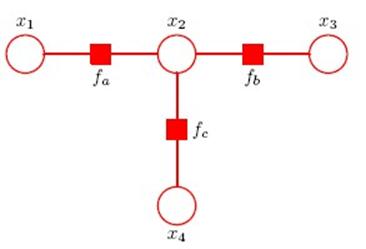上面的x1,x2,x3是原图的随机变量 ,下面的fa,fb,fc,fd是factor节点,只有随即变量节点和factor节点之间有连接,每类节点自身互不连接,每个factor连接的变量节点,是相互依赖的节点。