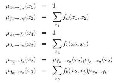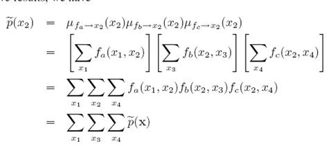 转换成factor图后,就是树形图了,符合前面树形图的两种情况,这时候,要求一个节点或一组节点的边界概率,用一种叫做sum-product的方法,已求一个节点的边界概率为例.