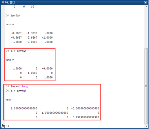 注意上面的a*inv(a)得到的结果已经不再是整数矩阵,Matlab存储结果的时候会以浮点的形式进行存储,Matlab实际存储的数值和当前命令窗口显示的数值是有区别的。为了获得更高的显示精度可以使用下面的数据格式