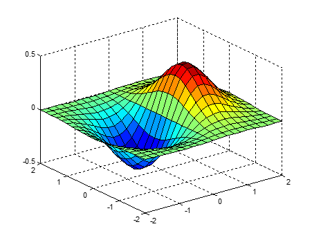 >> [X,Y] = meshgrid(-2:.2:2); Z = X .* exp(-X.^2 - Y.^2); surf(X,Y,Z)