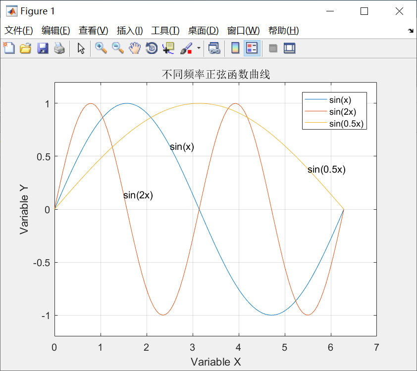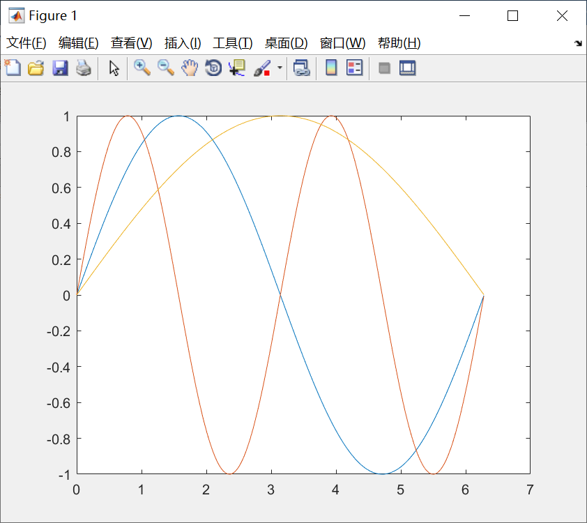 >> y=[sin(t1),sin(2*t1),sin(0.5*t1)];