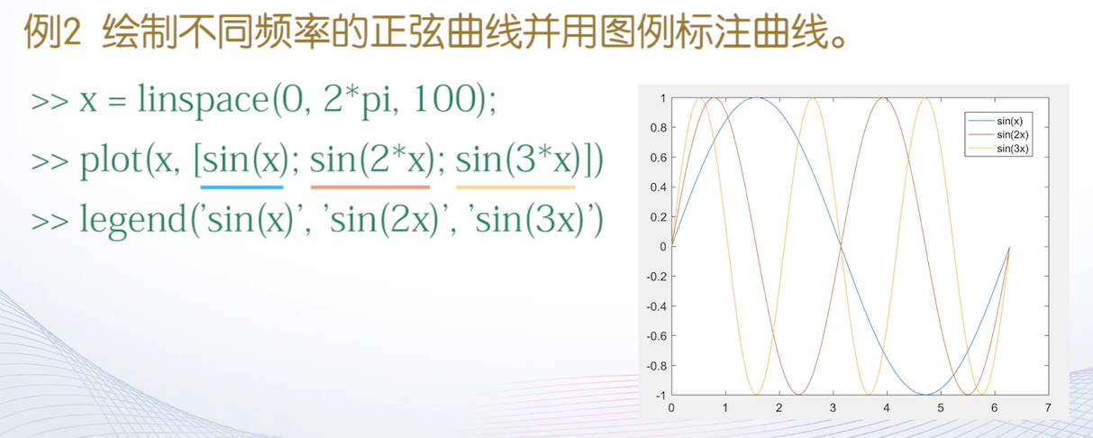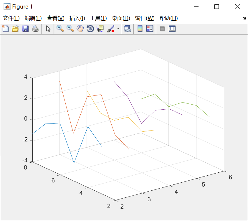 - 如果矩阵y的行数等于x的长度,则以向量x为横坐标,以y的每个列向量为纵坐标绘制曲线,曲线的条数等于y的列数。