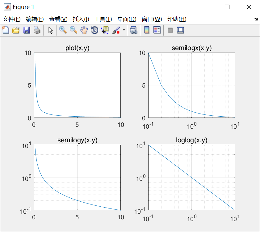 当x、y是同型矩阵时,以x、y对应列元素为横、纵坐标分别绘制曲线,曲线条数等于矩阵的列数。