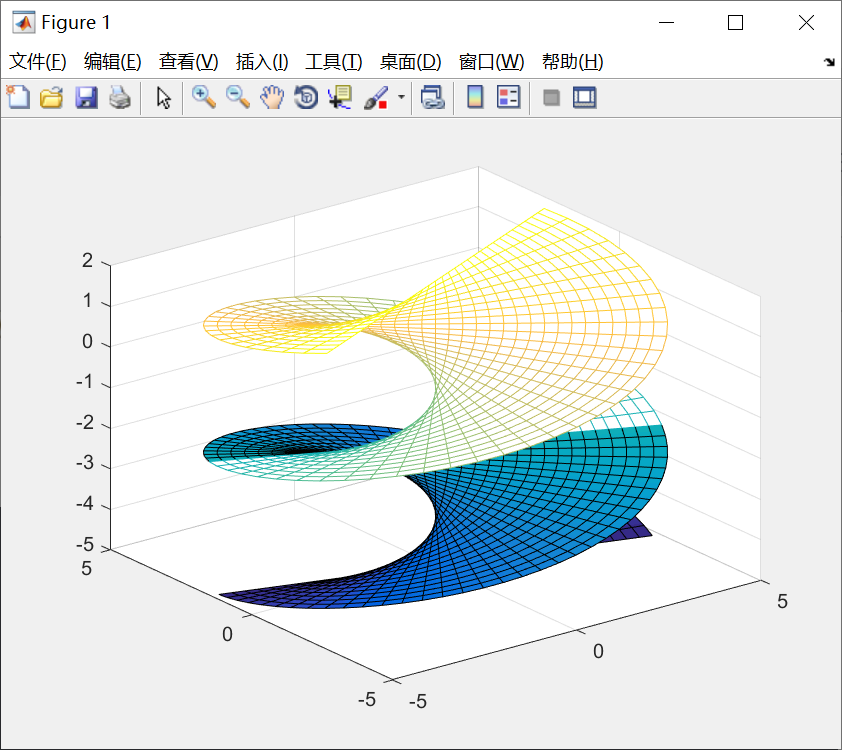 fmesh(funx,funy,funz,[-5,5,-2,2]);