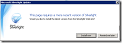 Silverlight可以自动实现向前兼容,也就是在低版本下编译的Silverlight包可以在高版本下运行,相反,在高版本下编译的Silverlight包不能再低版本下运行,此时Silverlight插件会显示一张默认的图片用来告知用户升级插件,并弹出一个提示框,如下图: