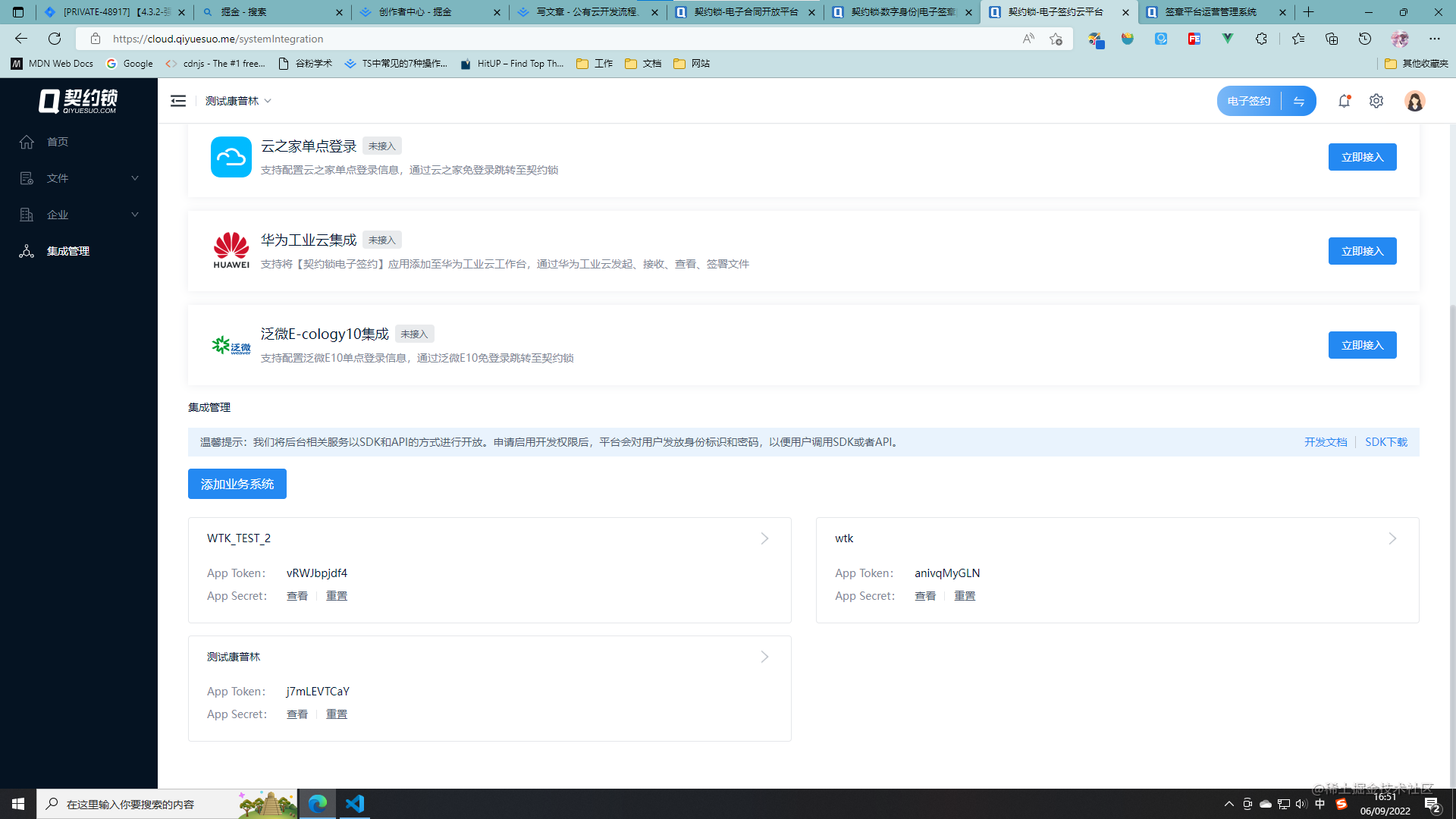 首先,登录 cloud.qiyuesuo.me。在集成管理中,选择添加业务系统。