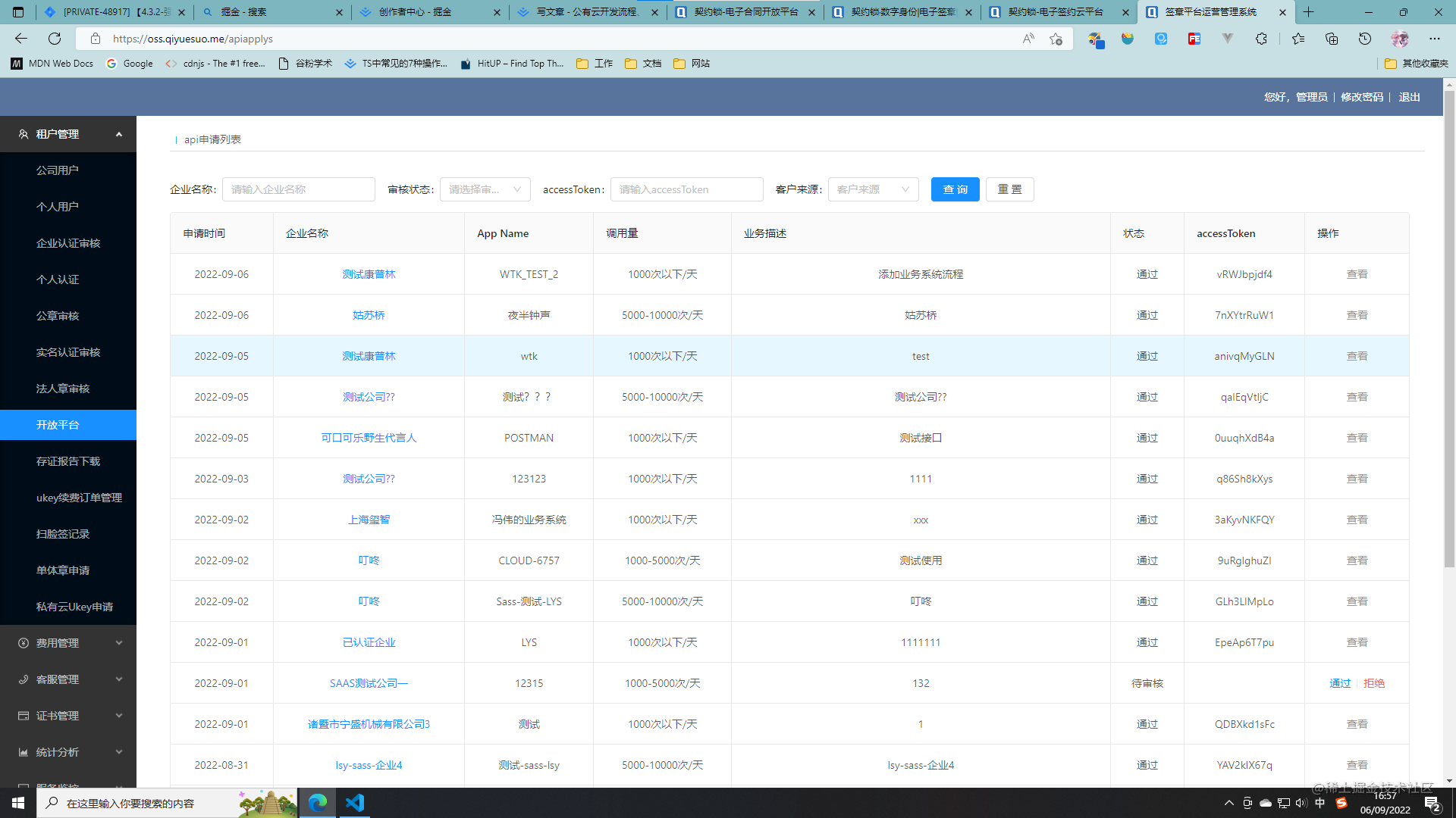 之后,登录 oss.qiyuesuo.me,点击租户管理——>开放平台,审核通过新创建的业务系统,并且给予全部权限。