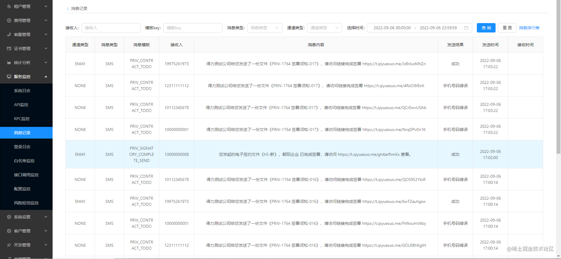 再次回到 oss.qiyuesuo.me环境,点击服务监控——>消息记录,可打开控制台查看验证码。