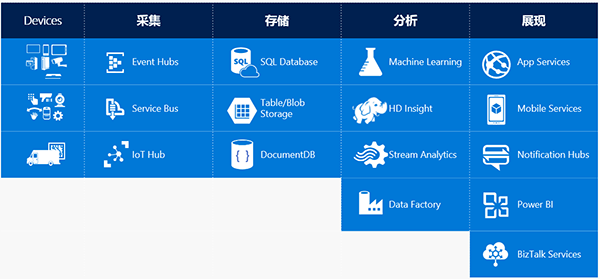 从上面的两图可以看出,微软云平台的接入仅仅是其中一个环节。更为重要的是数据的存储、分析,还有展现。特别是数据和分析部分,是大数据的基础,后续所谓的人工智能会基于这些环节发挥重要作用。