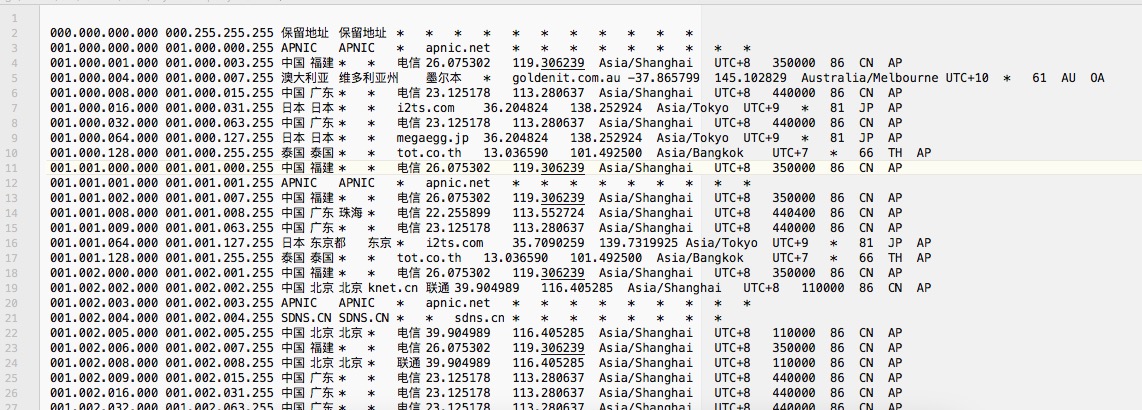 - TXT的文本格式简单清晰, 每行代表一个IP段, 总共有多少个IP段信息就有多少行