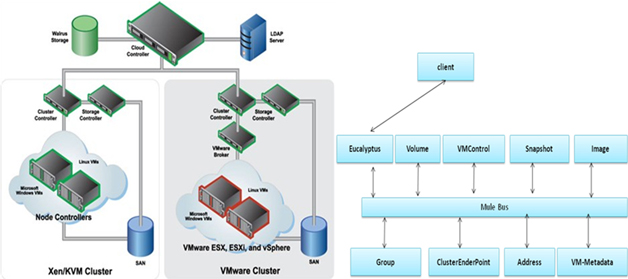 从组件服务角度看,每个集群中将计算和存储服务设计为独立服务,网络仍为与计算服务的一部分。尽管Eucalyptus在代码实现上是将网络部分独立出来的,但整体上并未按照独立的服务来设计,整体设计解耦不够。