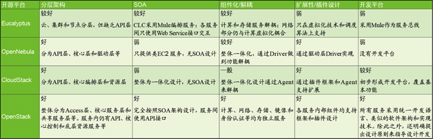 前面分别介绍了各IaaS开源云平台在分层、SOA、组件化、解耦及开发平台等方面的情况。