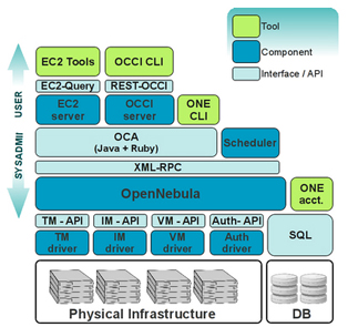 OpenNebula明显分为三层,即接口层、核心层和驱动层。接口层提供了原生的XML-RPC接口,同时实现了EC2、OCCI和OpenNebula Cloud API(OCA)等多种API,为用户提供了多种选择。