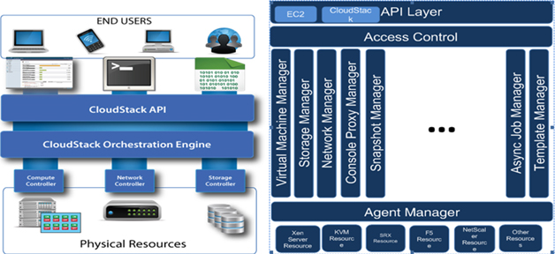 图 3中的左半部分为CloudStack的总体架构,可以看到其包括Dashboard/CLI层、CLoudStack API、核心引擎层和计算/网络/存储控制器层,是典型的分层架构。具体来看,CloudStack提供原生自定义API, 也通过cloud bridge支持AWS兼容API。