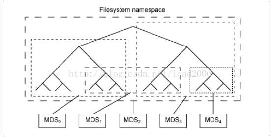 支持元数据服务器集群,将目录树动态划分为若干子树,每个子树都有两个副本在两个MDS上提供服务,一个MDS同时支持多个不同的子树: