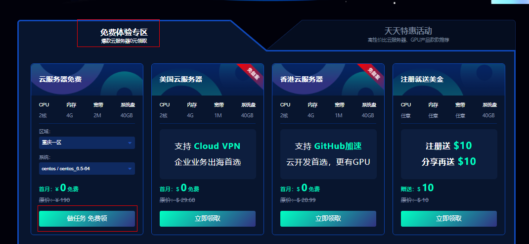 首先登录新睿云官网www.xinruiyun.cn,进入活动中心www.xinruiyun.cn/activity/,选择云服务器免费体验区,选择“做任务,免费领”,最长可以免费使用2个月。