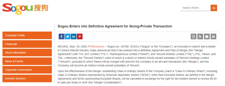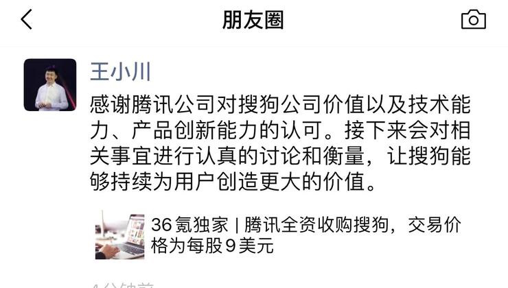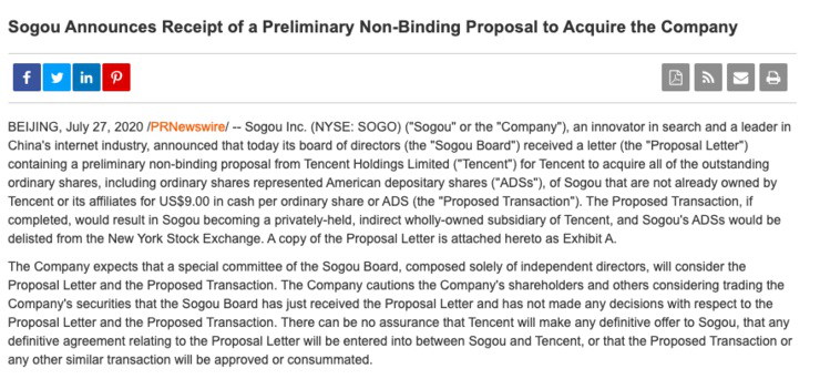 7 月 27 日,搜狗公司宣布:其董事会已收到腾讯的初步非约束性提案——这份提案的目的,就是收购。