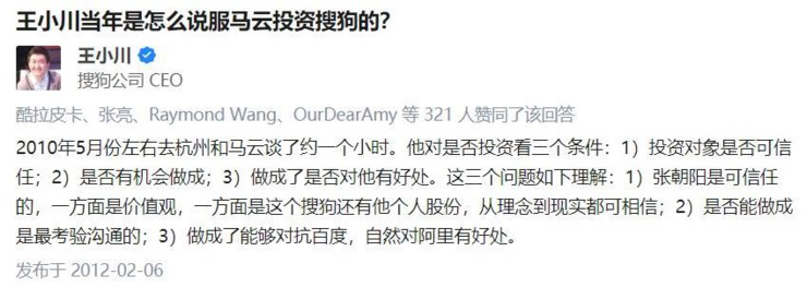2010 年 8 月 9 日,通过引入阿里巴巴、云锋基金以及搜狐 CEO 张朝阳旗下私人基金 , 搜狗从搜狐独立分拆,王小川担任 CEO 。