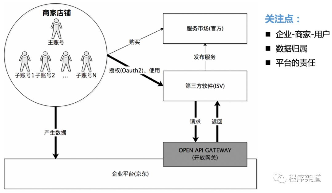 这里面的流程是这样的,商家会在他们的店铺上发布商品,最终用户,就是比如我们这些个体最终的消费者来购买商家的商品,这样的行为都会产生数据到企业平台上面;ISV会通过企业平台的开放接口来开发商家所需要的软件并发布到服务市场上面售卖;商家从服务市场去购买这些软件,比如购买了一款管理商品的软件,那么后续商家就可以使用这款软件更有效率的来管理他的店铺里面的商品,上新、更改图片、更改描述、上下架等等操作。
