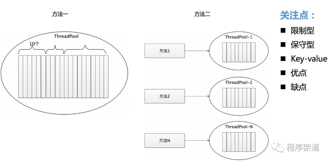 线程池隔离的这种方式的优点就是我们已经提到过的不同的业务处理使用线程的时候不会相互影响,缺点呢也很容易想到,就是会涉及线程调度的上线文切换,不过还是要评估一下这个缺点带来的影响是否会阻止你来使用线程池隔离的方式,比较它的优点更突出。