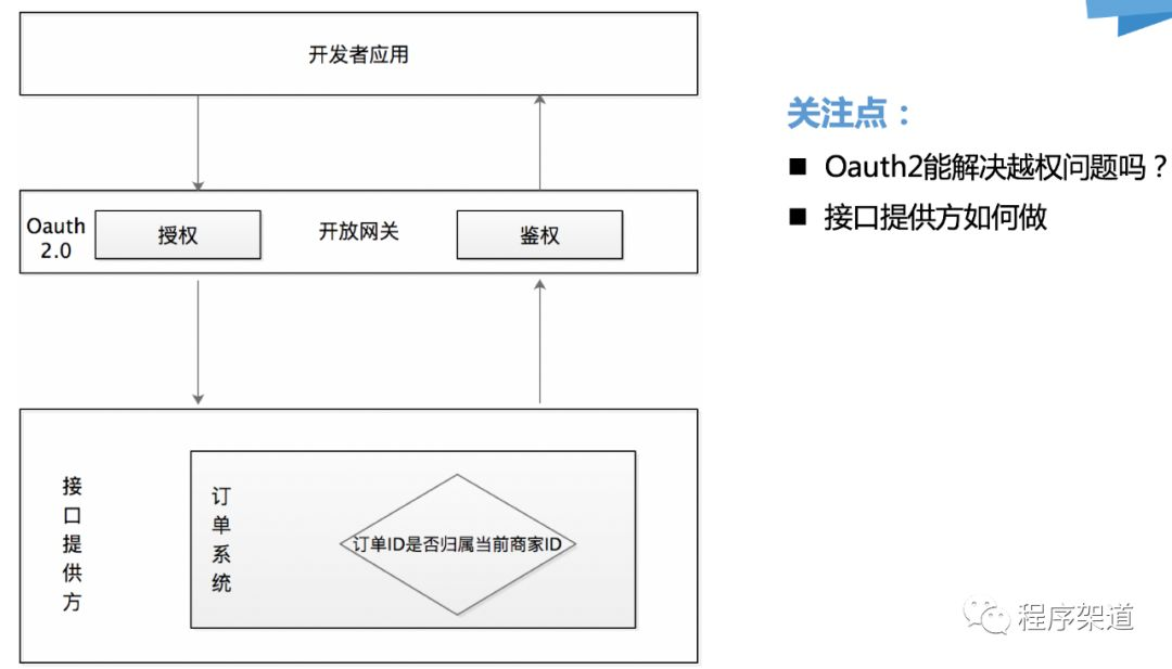 有了Oauth2就能解决越权的问题吗,答案是,否。授权在开放平台的环境下只是解决了ISV软件获取数据的"合法性",并不能够解决越权的问题,因为上文我们也提到了开放网关和开放授权,其中开放授权从技术的落地上来讲是放在了开放网关里面去验证的,但是开放网关所依赖的服务,比如订单服务、商品服务等,如果这些服务没有做数据归属的判断,仍然无法解决越权的问题。