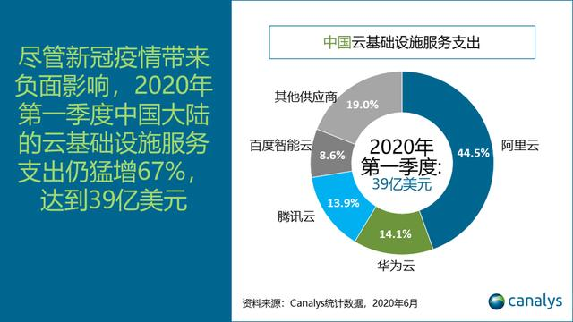 根据Canalys发布的报告数据显示,尽管新冠疫情带来负面影响,但中国的云基础设施服务市场在2020年第一季度仍同比猛增67.0%,今年Q1中国云基础设施服务支出达到39亿美元。