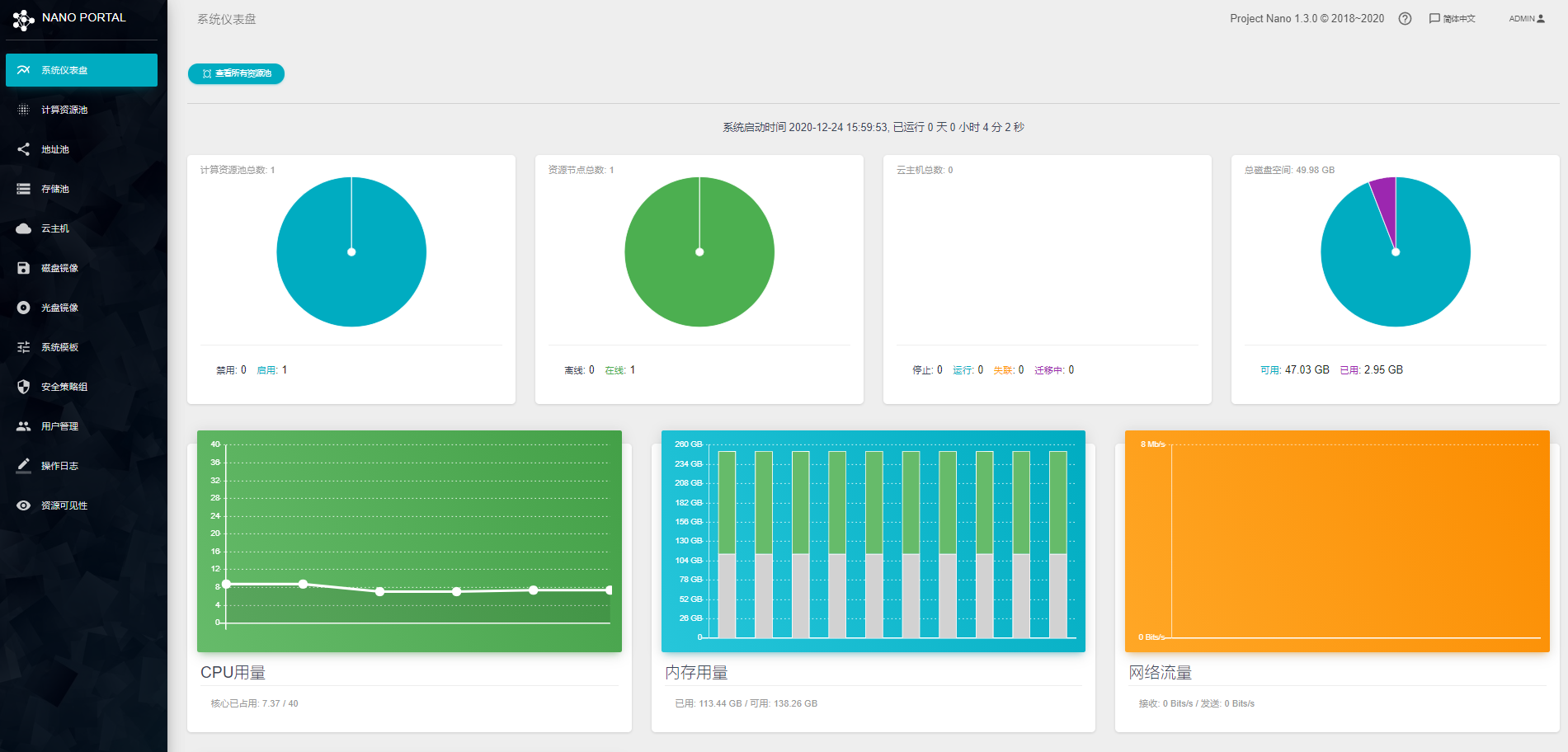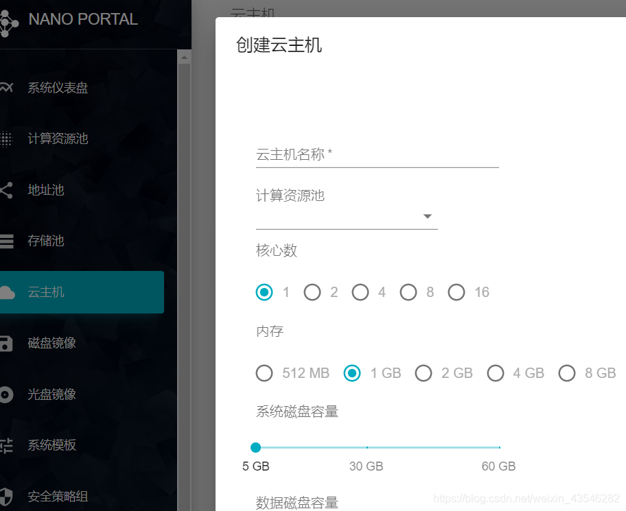 登录系统之后,参考配置手册在计算资源池里添加资源节点之后,就可以开始创建云主机实例了。你也可以上传或者构建新的光盘镜像或者磁盘镜像,用于快速批量部署实例。