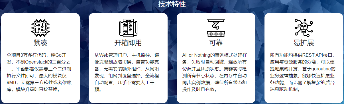 基于KVM技术,使用Go语言开发,简单易学的虚拟机管理软件,从Web管理门户、主机监控、镜像克隆到故障切换,功能完备,开箱即用,数分钟之内即可将您的服务器集群升级为云主机平台。