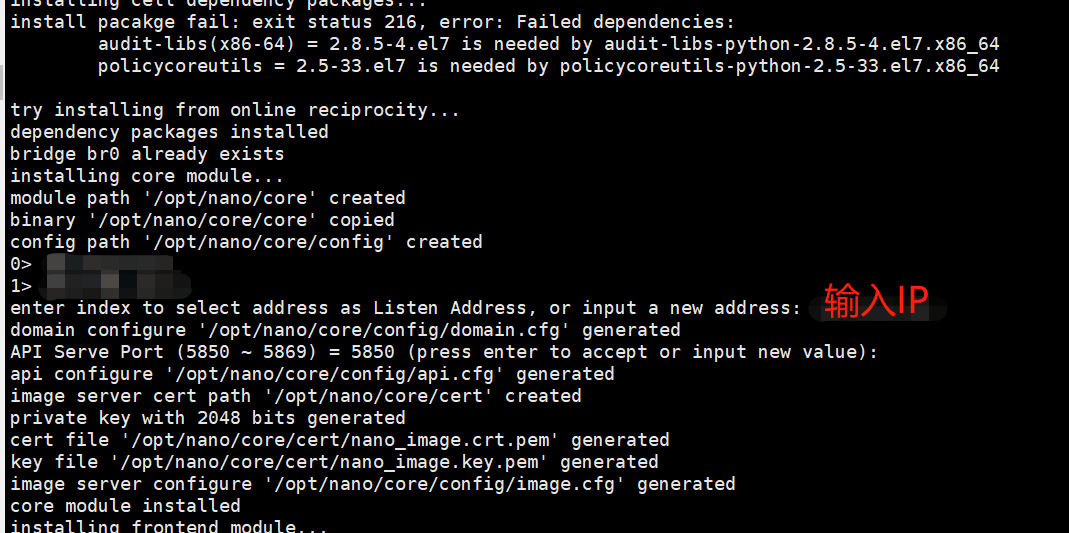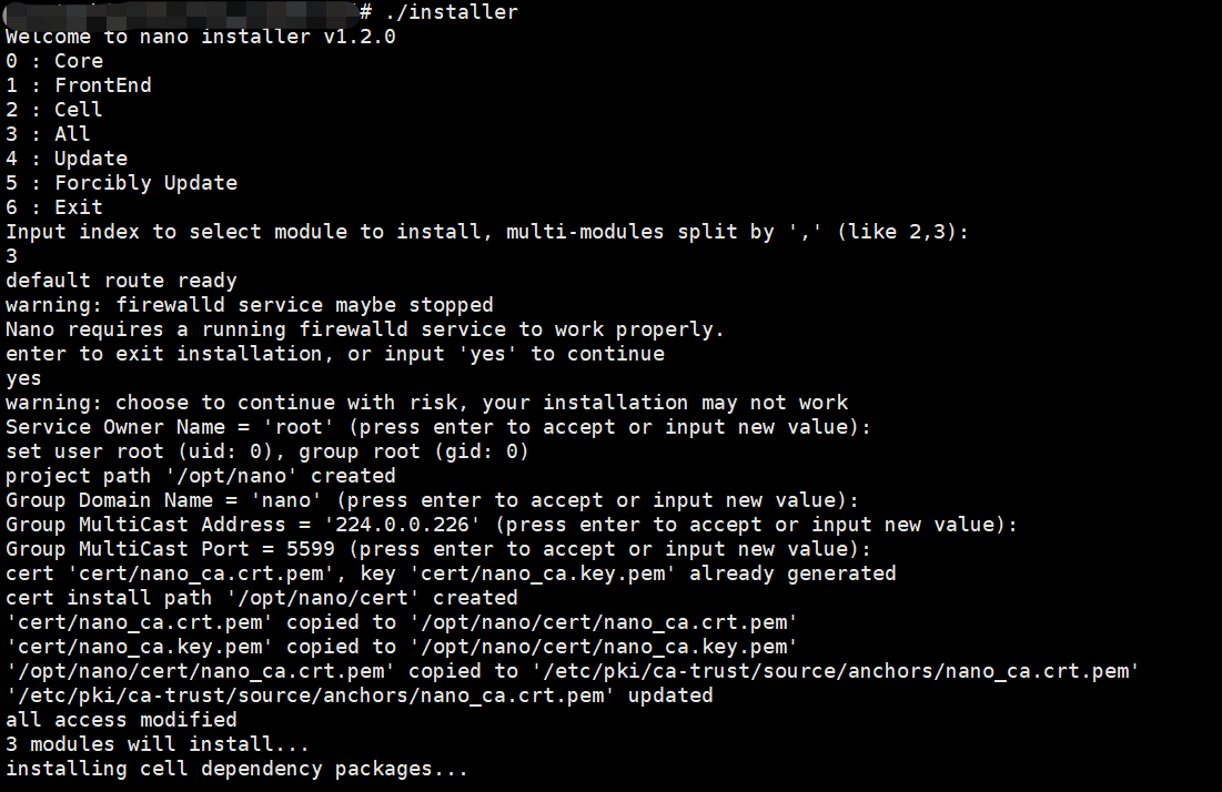 输入"0,1,2"或者"3"在当前服务器安装所有模块. 当您第一次安装Nano时,建议您使用安装程序建议的默认配置,无需修改。 如果你有多个网卡设备,请在安装程序的提示中选择连接内网的网卡设备进行安装。