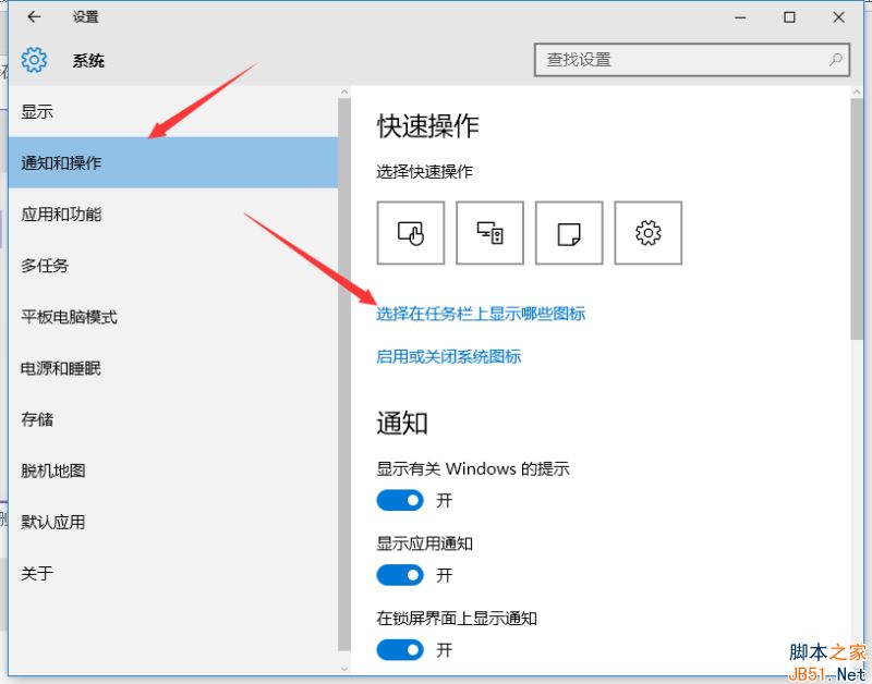 2、点击左侧的“通知和操作”选项,点击右侧的“选择在任务栏上显示哪些图标”。