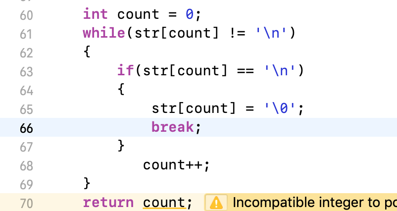 例如一下while循环,当str[count] = ‘n’ 时,还会进入循环,到break;才退出循环