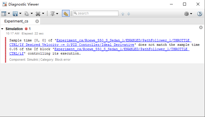 Sample time [0, 0] of 'Experiment_cs/Roewe_550_S_Sedan_1/ENABLED/PathFollower_1/THROTTLE CTRL/If Desired Velocity ~= 0/PID Controller/Ideal Derivative' does not match the sample time 0.05 of the If block 'Experiment_cs/Roewe_550_S_Sedan_1/ENABLED/PathFollower_1/THROTTLE CTRL/if' controlling its execution.