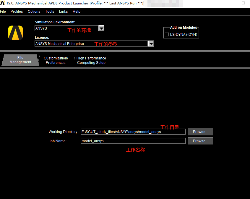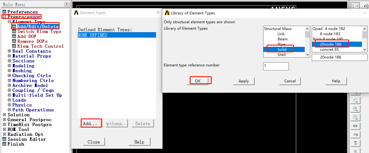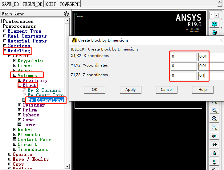 目录 一、ANSYS求解模态分析步骤 建模 施加载荷和求解 扩展模态(这是区别于其他分析的一个关键) 查看结果 二、模态分析实例(均匀直杆的子空间法模态分析) 1.问题描述 2.有限元分析 1)进入ansys经典界面 2)设置单元类型:Solid Brick 20 node 186 3)设置材料属性 4)建模 5)划分网格单元 6)加载:模态分析只有零约束 7)分析的相关设置 8)扩展模态阶数设置 9)求解 10)查看分析结果 11)动画观察某一阶数的振动模态 12)查看某一阶数的振型云图 疑问? 模态分析的理论基础可见: https://blog.csdn.net/qq_45769063/article/details/106391925 模态分析用于分析结构的振动特性,即确定结构的固有频率和振型,它也是谐响应分析、瞬态动力学分析以及谱分析等其他动力学分析的基础。 Ansys提供的模态提取方法有:子空间法(subspace)、分块法(block lanczos)、缩减法(reduced/huoseholder) 、动态提取法( power dynamics ) 、非对称法(unsymmetric)、阻尼法(damped)、QR尼法(QR damped)等,大多数分析都可使用子空间法、分块法、缩减法来完成。 模态分析包括建模、施加载荷和求解、扩展模态和查看结果等几个步骤。 模态分析的建模过程与其他分析相似,包括定义单元类型、定义单元实常数、定义材料特性、建立几何模型和划分网格等。需要注意的是Ansys的模态分析是线形分析(即模态分析的材料特性设置在线性那里进行设置Linear-Elastic-Isotropic),任何非线性特性,例如塑性、接触单元等,即使被定义了也将被忽略。在材料特性中必须定义材料的弹性模量和密度。 包括指定分析类型、指定分析选项、施加约束、设置载荷选项,并进行固有频率的求解等。 指定分析类型:Main Menu->Solution->Analysis Type->New Analysis,选择Modal。 指定分析选项:Main Menu->Solution->Analysis Type->Analysis Option,选择MODOPT(模态提取方法),设置模态提取数量MXPAND。 若使用缩减法,需定义主自由度。 施加约束:Main Menu->Solution->Define Loads->Apply->Structural->Displacement.在模态分析中载荷施加只有零约束,即全约束,其他任何形式的载荷施加都会被忽略 求解:Main Menu->Solution->Solve->Current LS. 如果要在POST1中观察结果,必须先扩展模态,即将振型写入结果文件。过程包括重新进入求解器、激活扩展处理及其选项、指定载荷步选项、扩展处理等。 激活扩展处理及其选项:Main Menu->Solution->Load Step Opts->Expansionpass->Single Expand->Expand modes. 扩展处理:Main Menu->Solution->Solve->Current LS. 扩展模态可以如前述办法单独进行,也可以在施加载荷和求解阶段同时进行。 模态分析的结果包括结构的频率、振型、相对应力和力等。 拾取菜单Main Menu-Preprocessor-Meshing-MeshTool。弹出对话框,单击''Size. Controls'',区域中"Lines"后"Set",按钮,弹出拾取窗口,任意拾取块x轴和y轴方向的边各一条(短边),单击OK"按钮,弹出对话框, 在"NDIV"文本框中输入3,单击"Apply"按钮:再次弹出拾取窗口,拾取块z轴方向的边(长边),单击"OK"按钮。在"NDIV"文木框中输入15,单击"OK"按钮。 在Mesh区域,选择单元形状为"Hex"(六面体),选择划分单元的方法为"Mapped"(映射)单击Mesh按钮,弹出拾取窗口,单击"OK"按钮。 拾取菜单Main Menu--Solution-Define Loads-Apply-Structural-Displacement-On Areas弹出拾取窗口,拾取z=0的平面,单击"OK"按钮.弹出对话框,在列表中选择"UZ",单击"Apply"按钮;再次弹出拾取窗口,拾取y=0的平面,单击"OK"按钮,弹出对话框,在列表中选择"UY",单击"Apply"按钮再次弹出拾取窗口,拾取x=0的平面,单击"OK"按钮,弹出对话框,在列表中选择"UX",单击"OK"按钮。所加约束与图8-1不同.主要是为了与推导式(8-1)所作的轴向振动假设一致。约束施加的正确与否,对结构模态分析的影响十分显著,因此对于该问题应十分注意,保证对模型施加的约束与实际情况尽量符合 (对于约束怎么约束这个暂时不懂)??? 拾取菜单Main Menu-Solution-Analysis Type-New Analysis。弹出对话框,选择"Type of Analysis"为"Modal",单击"OK"按钮。 拾取菜单Main Menu-Solution-Analysis Type-Analysis Options。弹出对话框,在"No. of modes to extract"文本框中输入5,单击“OK"按钮:弹出"Block Lanczos Method",单击"OK"按钮。 拾取菜单Main Menu-Solution-Load Step Opts-Expansionpass-Single Expand-Expand modes。弹出对话框,在"NMODE"文本框中输入5,单击"OK"按钮。 拾取菜单Main Menu-Solution-Solve-Current LS 拾取菜单Main Me-General Postproc-Results Summary。弹出窗口,列表中显示了模型的前5阶频率,与表8-1相对照,可以看出结果虽然存在一定的误差,但与解析解是基本符合的。查看完毕后,关闭该窗口 从结果文件读结果,拾取菜单Main Menu-General Postproc-Read Results-First Set. 改变视点,为便于更好地观察模型的模态。拾取菜单Utility Menu-PlotCtrls-Pan Zoom Rotate.在弹出的对话框中,单击“Left”按钮. 拾取菜单Utility Menu-PlotCtrls-Animate-Mode Shape。弹出对话框,单击“OK”按钮。观察完毕,单击“Animation Controller”对话框的"close"按钮。 拾取菜单Main Menu-General Postproc-Read Results-Next Set.依次将其余各阶模态的结果读入,然后重复步骤15 观察完模型的各阶模态后,请读者自行分析频率结果产生误差的原因,并改进以上分析过程。 先在READ result那读取想看的阶数,再plot results进行云图绘制 1.模态分析的激励是从哪里来的? 2.模态分析时约束该怎么设置?即怎么根据实例来进行位移的约束施加? 答案见:https://blog.csdn.net/qq_45769063/article/details/106398686