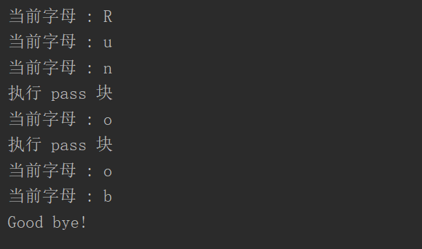 以下实例在字母为 o 时 执行 pass 语句块:
