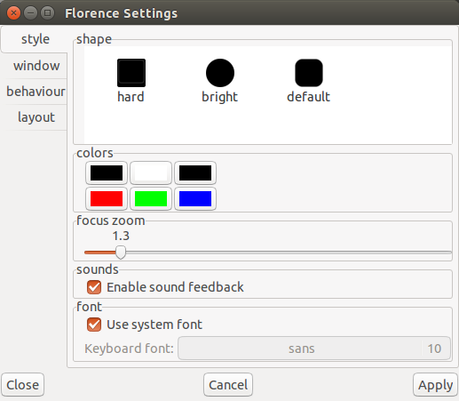 在 Florence 的 "样式 (style)" 菜单中,你能够自定义键盘样式,启用/取消声音效果。
