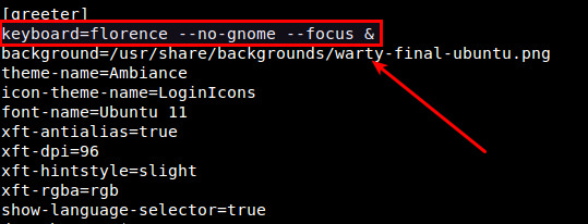 然后用编辑器打开欢迎界面配置文件 (/etc/lightdm/lightdm-gtk-greeter.conf),指定 Florence 作为屏幕键盘来使用。如果你愿意,你也能够使用 Ubuntu 的默认屏幕键盘 onboard 来代替 Florence。
