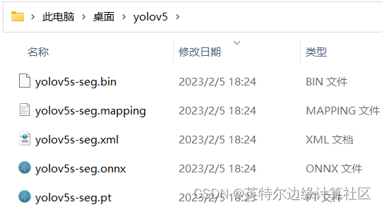 然后运行命令获得yolov5s-seg IR格式模型:yolov5s-seg.xml和yolov5s-seg.bin,如下图所示