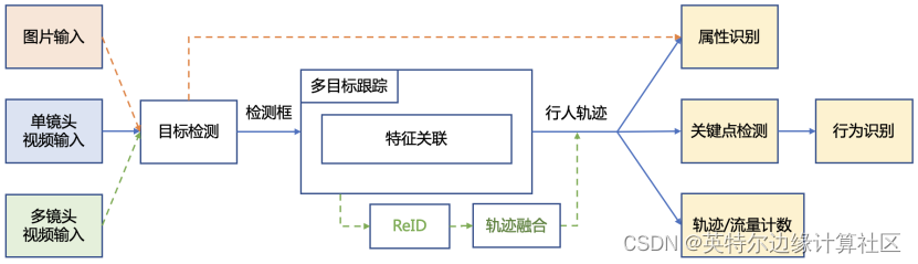 PP-Human支持单张图片、图片文件夹单镜头视频和多镜头视频输入,经目标检测以及特征关联,实现属性识别、关键点检测、轨迹/流量计数以及行为识别等功能,如下图所示。本文将以行人摔倒识别为例,基于OpenVINOTM进行多种模型联合部署。