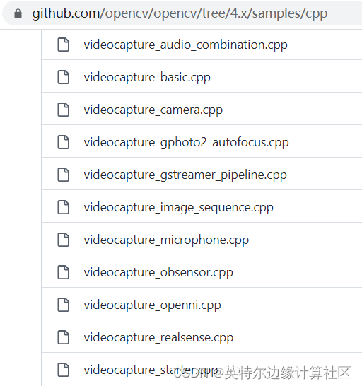 若是从视频流(例如,视频文件、网络摄像头、3D摄像头(Realsense)等)中,一帧一帧读取图像数据到内存,则使用cv::VideoCapture类,对应范例代码请参考OpenCV官方范例代码:opencv/samples/cpp at 4.x · opencv/opencv · GitHub。