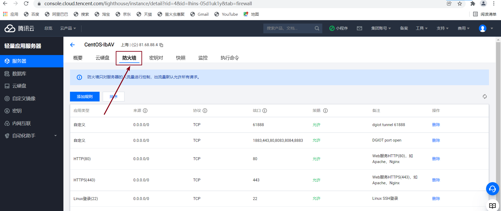 系统需要开启端口进行数据传输,云服务默认没有开启对应端口,需要在防火墙上添加安全规则,操作如下(以腾讯云为例)