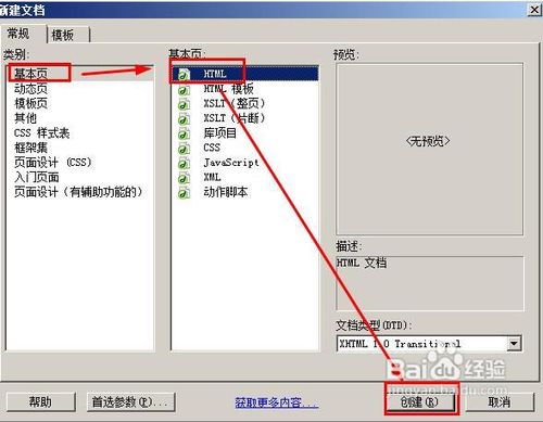 1、打开dreamweaver,按快捷键“ctr+N”来到“新建文档”界面,我们新建一个基本html页面。