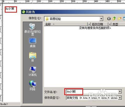 6、接着将这两个文件存起来。按快捷键“trl+s”,弹出这个对话框。文件名设为du小策,然后点击确定。