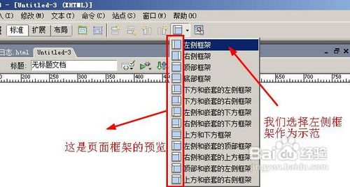 8、在标签栏选择框架类型,如图所示,这是页面的整体布局,左侧是预览图,右侧hi名称,我们选择第一个作为示范。